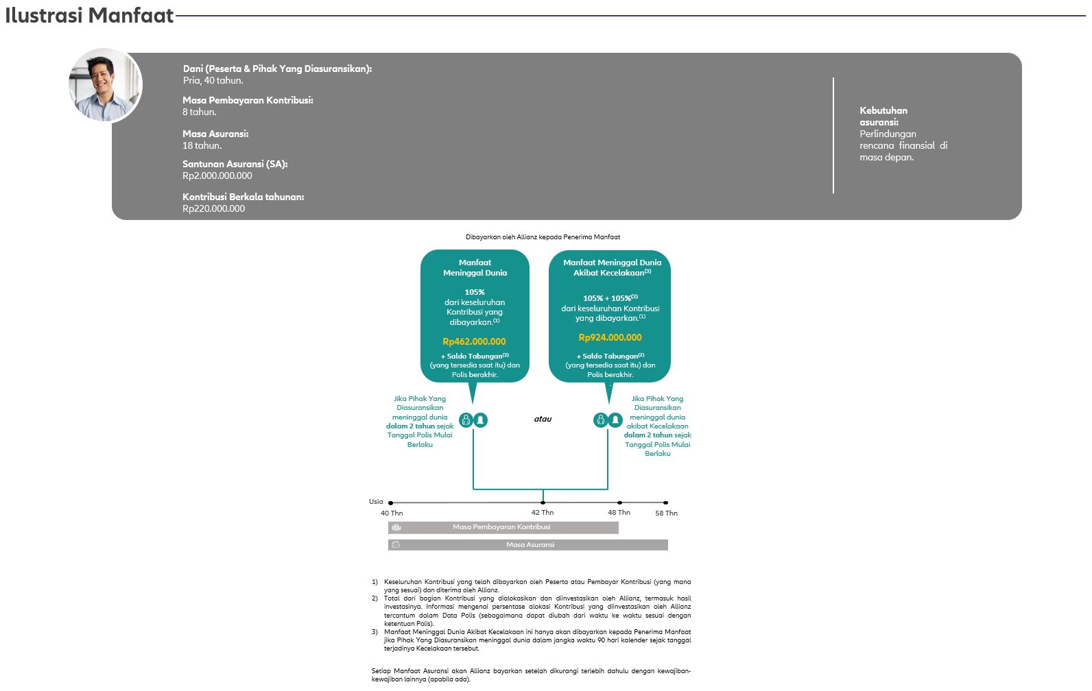 - Peserta atau Pembayar Kontribusi (yang mana yang sesuai) akan dibebaskan dari kewajiban pembayaran Kontribusi Asuransi Dasar, terhitung sejak Tanggal Jatuh Tempo Pembayaran Kontribusi berikutnya (setelah tanggal persetujuan klaim oleh Allianz) hingga akhir Masa Pembayaran Kontribusi; dan