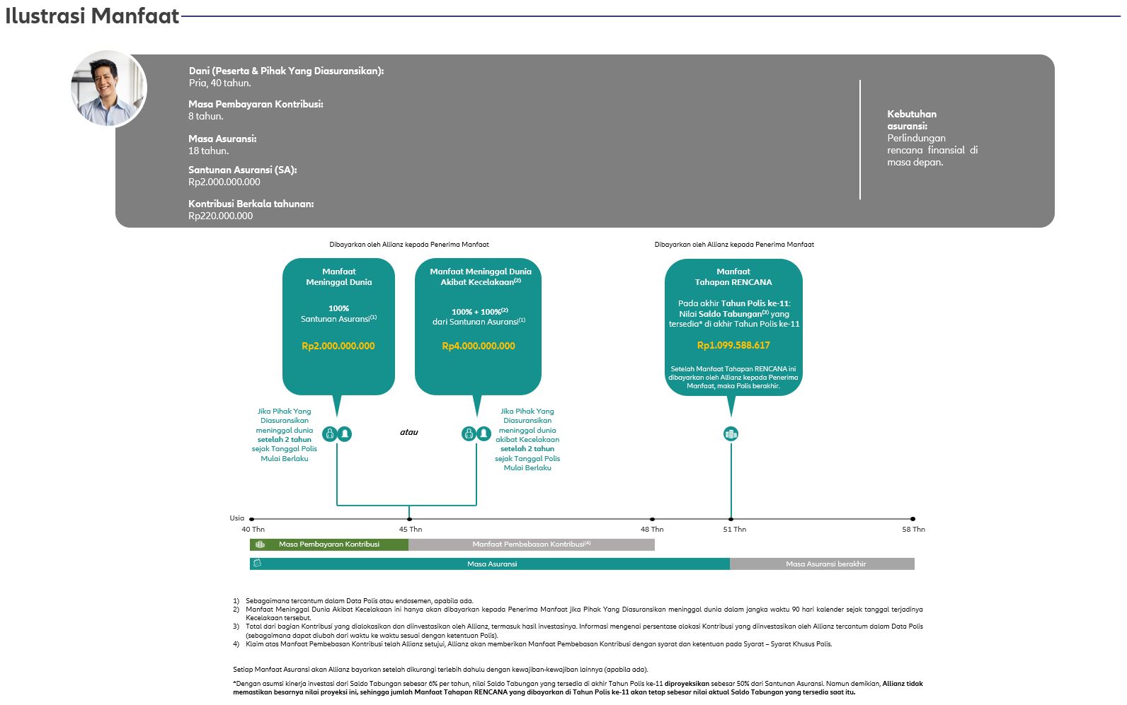 *) Nilai Saldo Tabungan yang tersedia di akhir Tahun Polis ke-11 diproyeksikan sebesar 50% dari Santunan Asuransi. Namun demikian, Allianz tidak memastikan besarnya nilai proyeksi ini, sehingga jumlah Manfaat Tahapan RENCANA yang dibayarkan di Tahun Polis ke-11 akan tetap sebesar nilai aktual Saldo Tabungan yang tersedia saat itu.