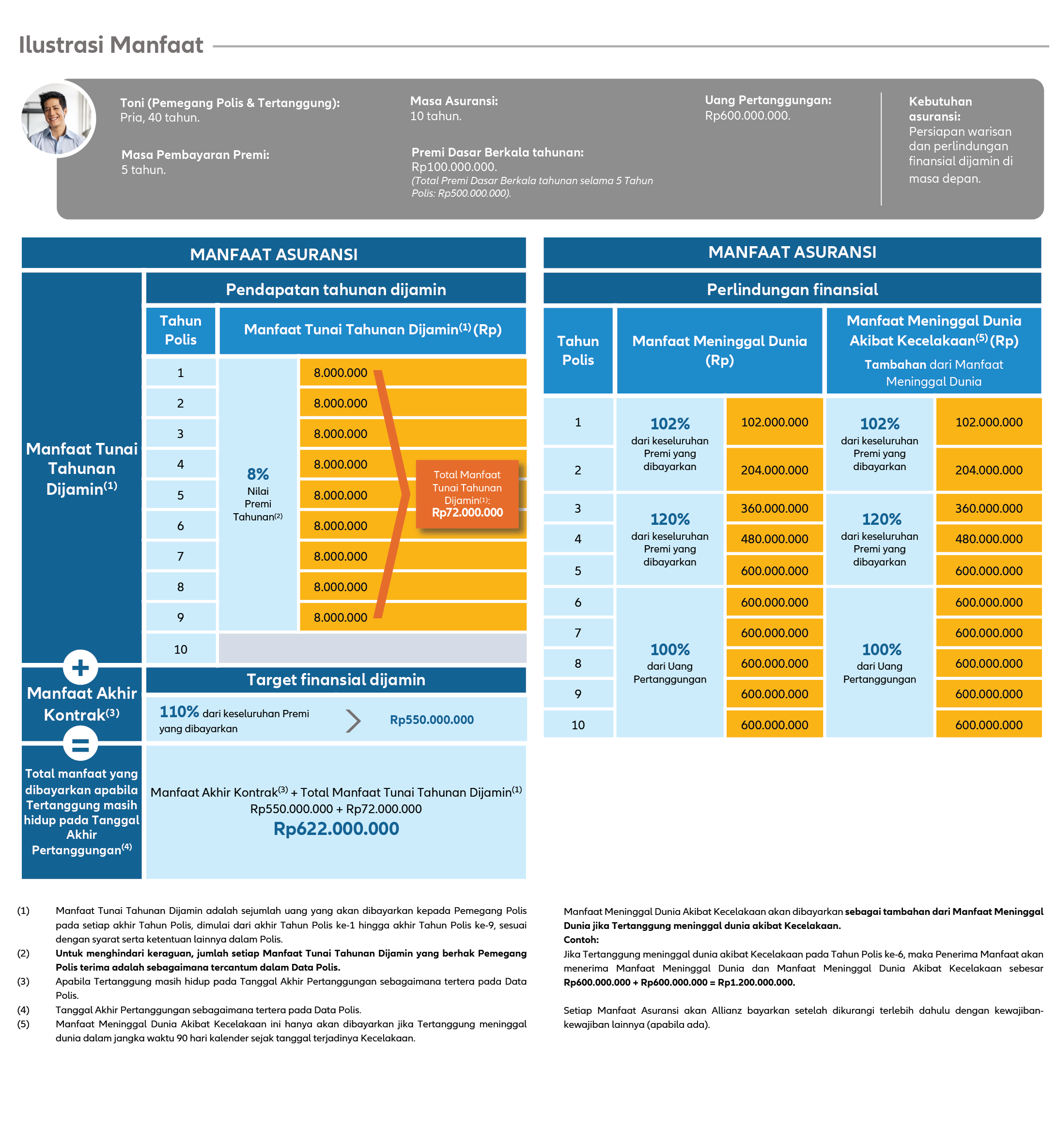 Manfaat Meninggal Dunia yang akan Allianz bayarkan kepada Penerima Manfaat sebesar 102% dari keseluruhan Premi yang dibayarkan jika Tertanggung meninggal dunia pada saat Tahun Polis ke-1 dan Tahun Polis ke-2; atau sebesar 120% dari keseluruhan Premi yang dibayarkan jika Tertanggung meninggal dunia pada saat Tahun Polis ke-3 sampai Tahun Polis ke-5; atau sebesar Uang Pertanggungan jika Tertanggung meninggal dunia pada saat Tahun Polis ke-6 dan seterusnya selama Masa Asuransi.