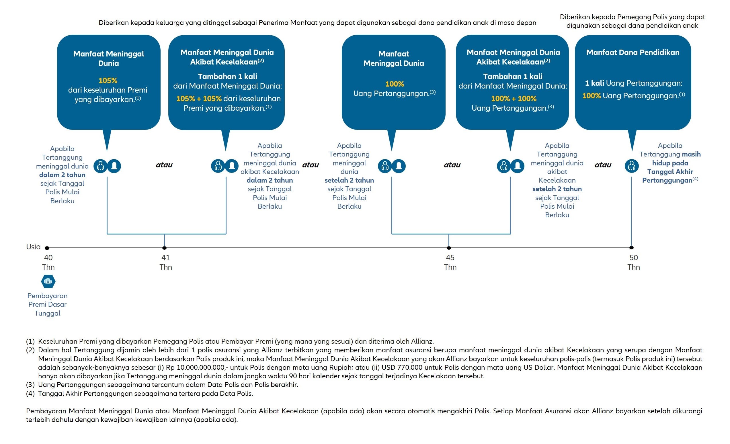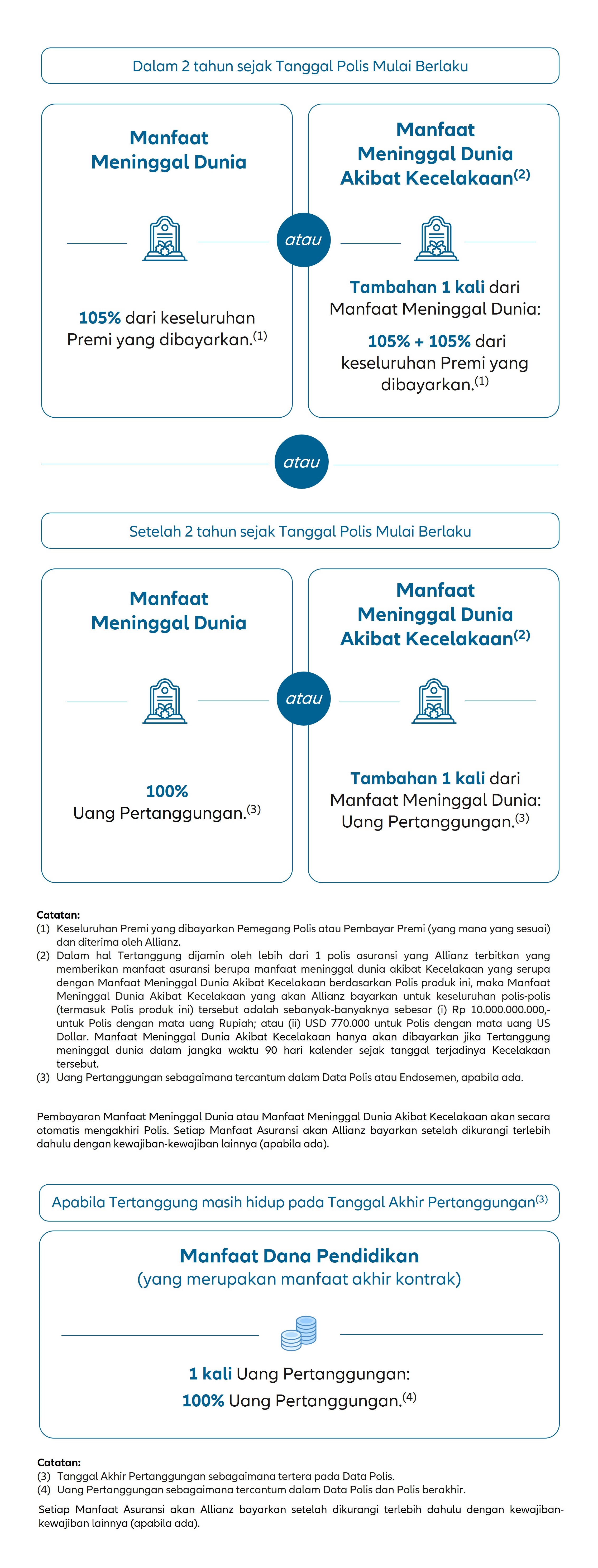 Manfaat Meninggal Dunia sebesar 105% dari keseluruhan Premi yang dibayarkan(1) jika Tertanggung meninggal dunia dalam 2 Tahun Polis(2) atau sebesar Uang Pertanggungan(3) jika Tertanggung meninggal dunia setelah 2 Tahun Polis(2).