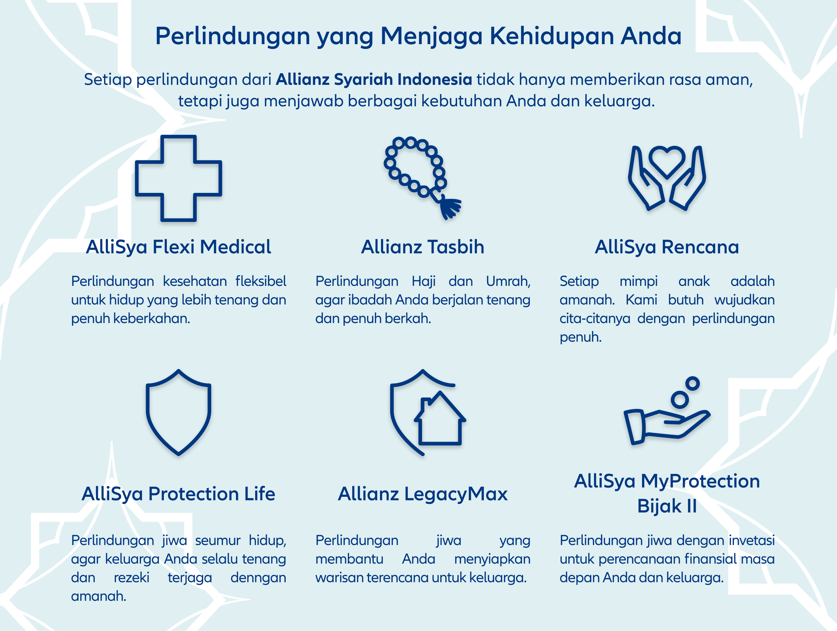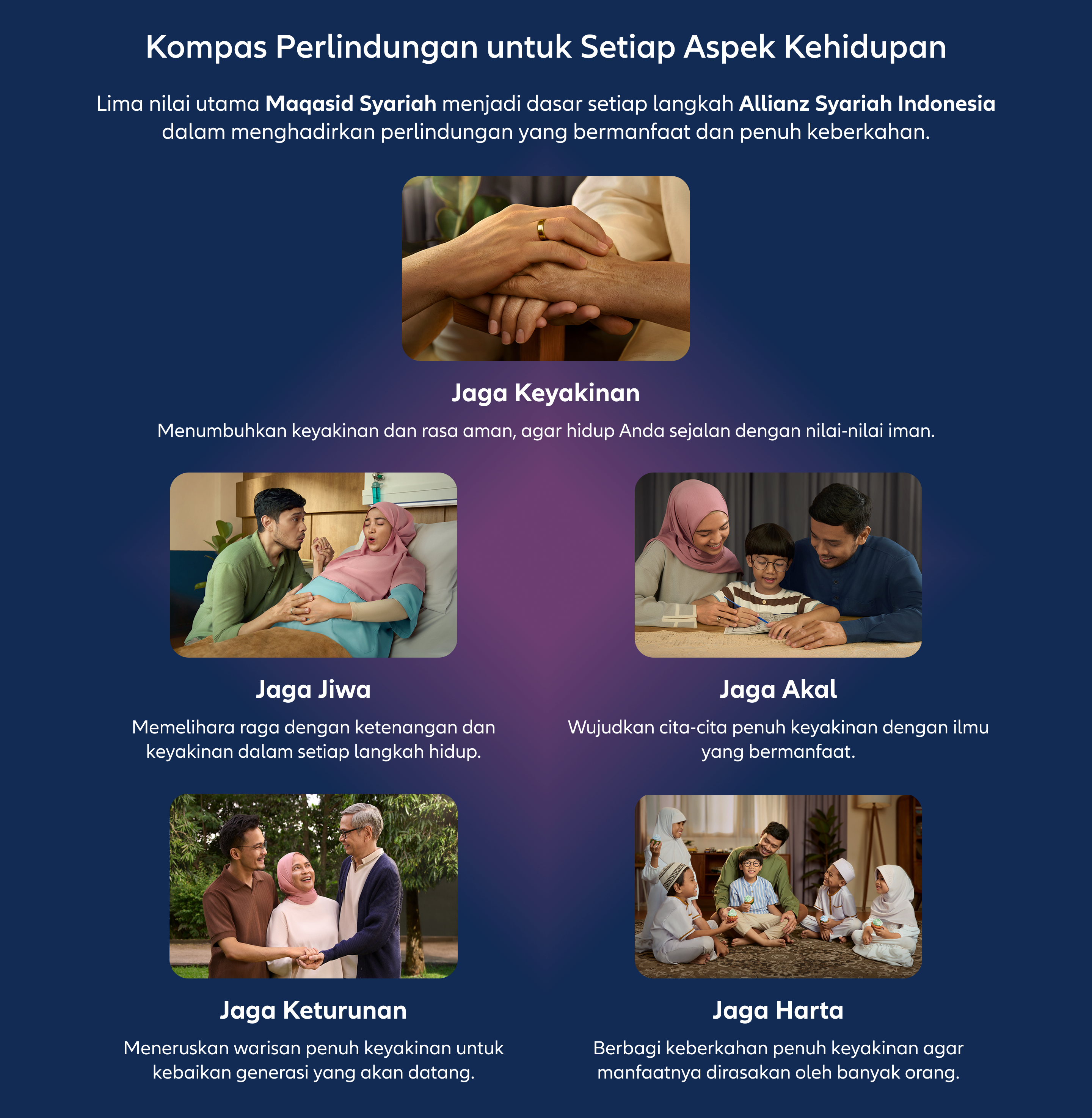 Hidup selalu menghadirkan momen penting, momen yang ingin dijaga, dirawat, dan diberkahi. Di setiap momen itu, Allianz Syariah Indonesia hadir untuk melindungi Anda dengan keyakinan yang berpijak pada nilai Maqasid Syariah. Karena bagi kami, perlindungan bukan sekadar layanan, tetapi wujud kepedulian untuk menjaga keberkahan dan kebaikan hidup Anda. Dengan nilai Maqasid Syariah sebagai dasar, kami berkomitmen menghadirkan perlindungan yang bermakna. Melindungi yang berharga di setiap momen kehidupan Anda, kini dan nanti.