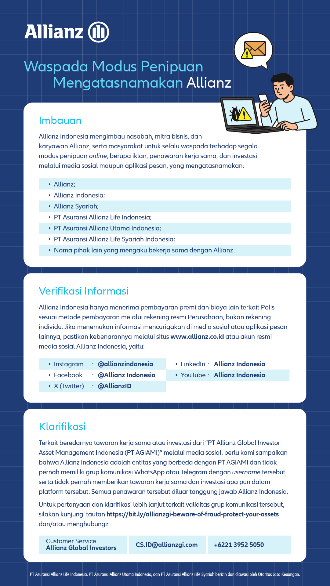 Allianz Indonesia adalah entitas perusahaan yang tidak memiliki Grup WhatsApp/Telegram, serta tidak pernah menawarkan kerja sama maupun investasi melalui platform apapun.